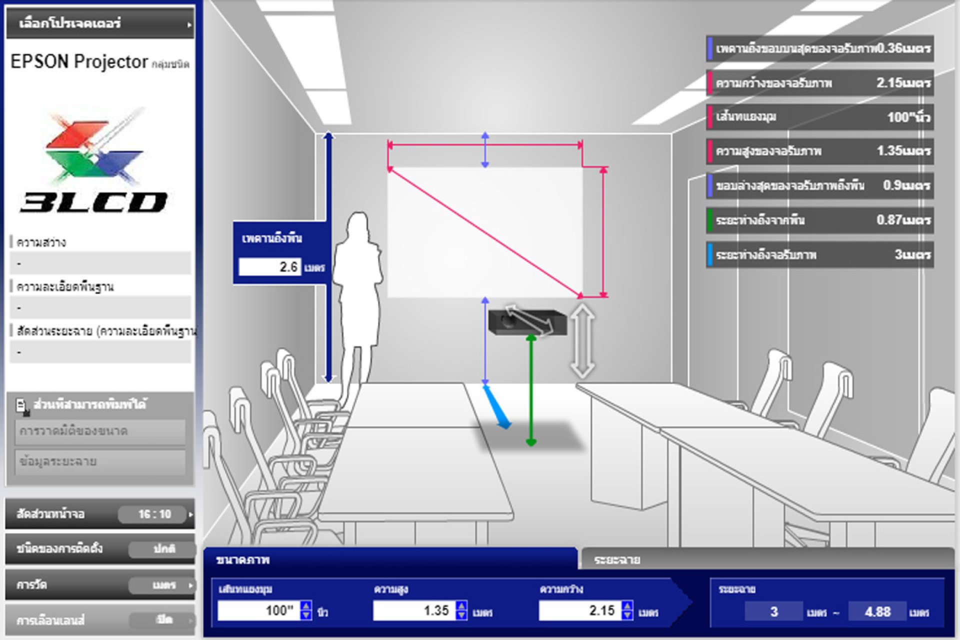 | โปรแกรมคำนวนระยะฉาย Epson | โปรแกรมคำนวนระยะฉาย Panasonic | |